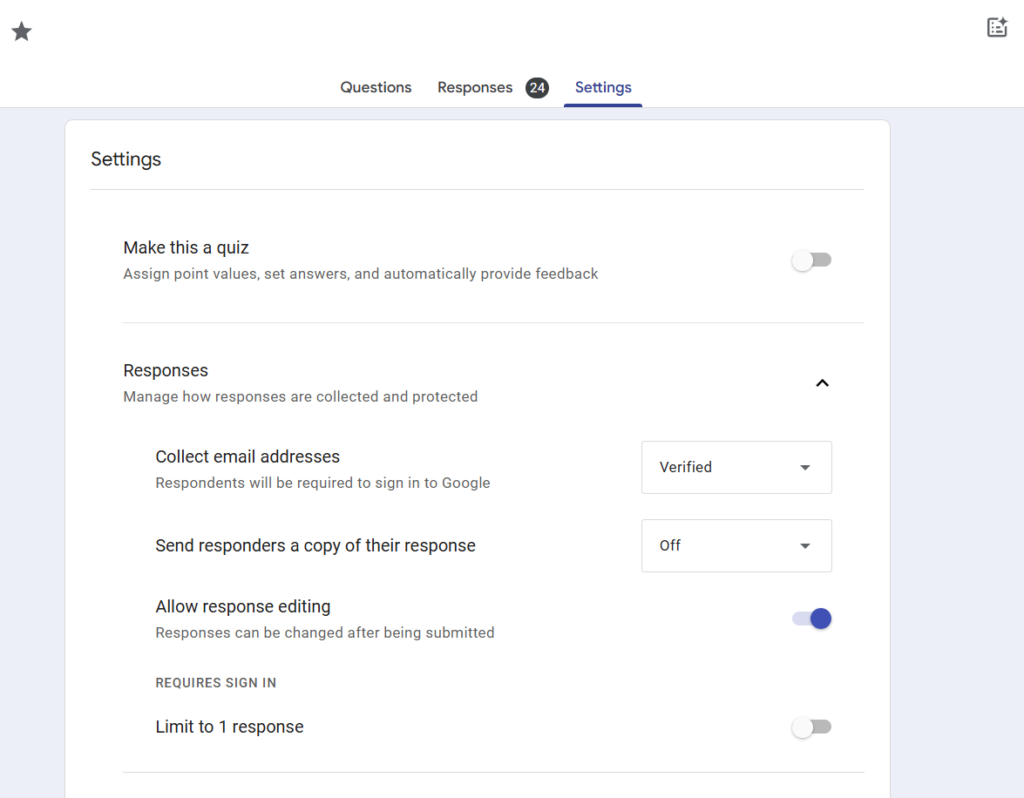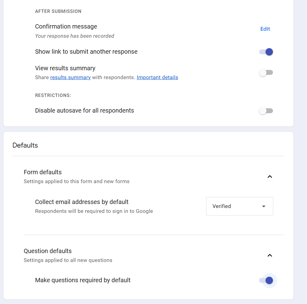Header for your form.Settings for the form. Some are personal, but this let’s me and Josh know who entered the data.I have the email addresses required by default and the same for questions. (You can set some as not required.)